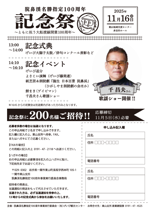 来る11月16日の日曜日、一関市東山町の東山地域交流センターでは「猊鼻渓名勝指定100周年の記念祭」が開催撮れます。当日は13時から記念式典の他、14:10から記念イベントが開催されます。尚、記念祭の参加にはには招待券が必要となり、200名様限定です。尚、応募用紙は下記の様式となり、必要事項をご記入の上、実行委員会にお申込みま下さい。