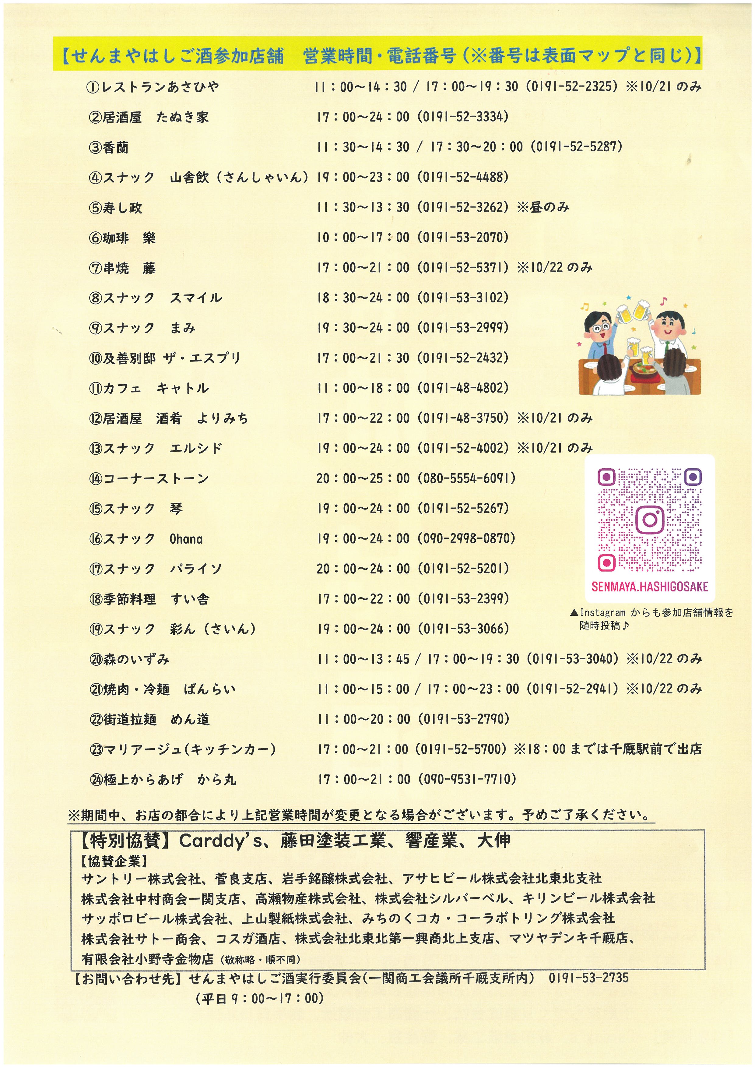 千厩はしご酒の加盟店と営業時間は下記の通り。9/22に限り、一ノ関駅からはJR券付のはしご酒プランもあります。千厩はしご酒については事務局、せんまやはしご酒実行委員会(一関商工会議所千厩支所)℡ 0191-53-2735まで。